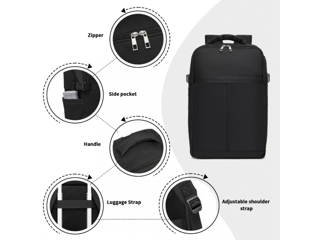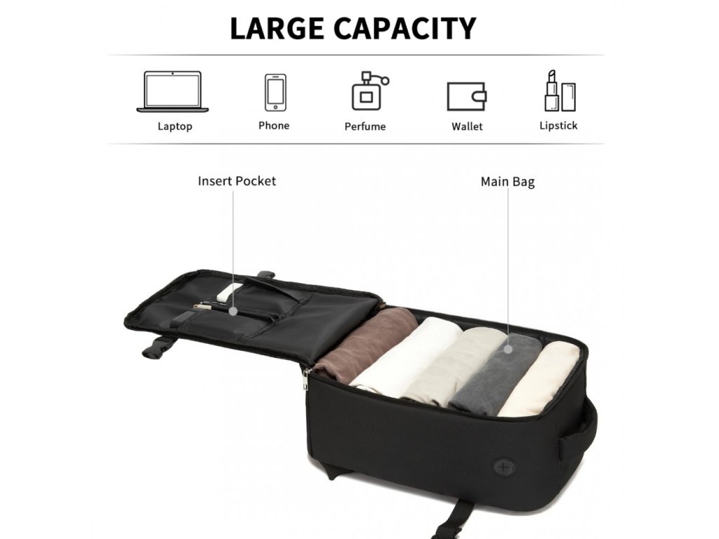 - Hlavná komora: Otvára sa ako kufor – jednoduchý prístup k oblečeniu a cestovným veciam.