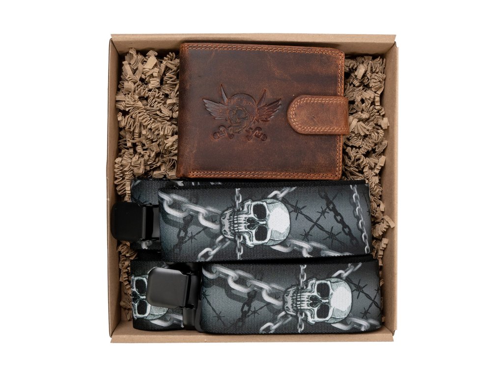 Darčekový set pre muža - Kožená peňaženka a traky - Lebka