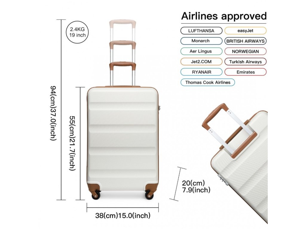 - 19” kabínový kufor: 55 × 38 × 20 cm / 2,4 kg / cca 38 litrov – vhodný pre väčšinu aeroliniek (BA, EasyJet, Jet2).