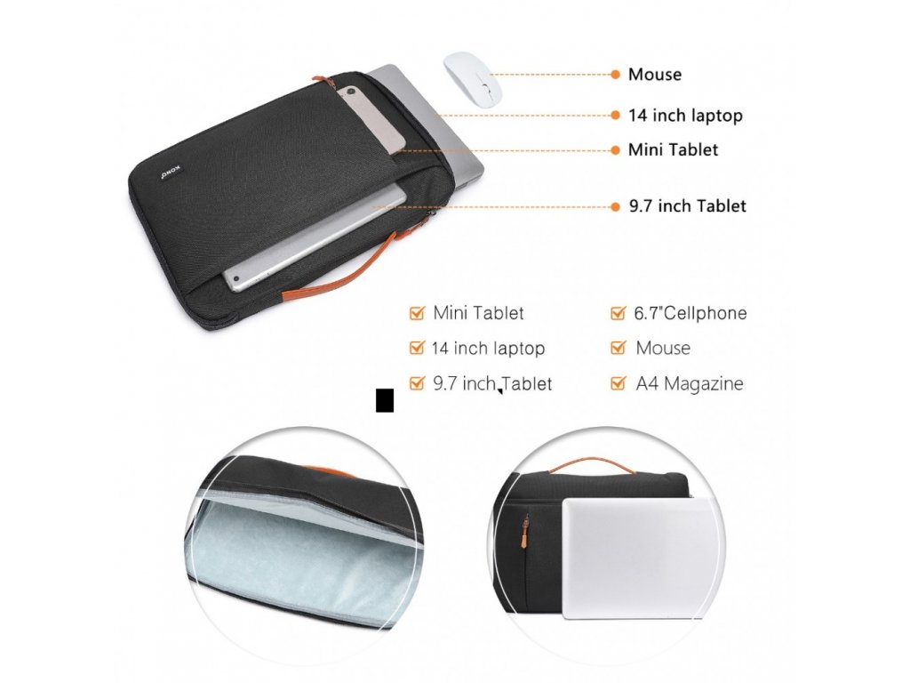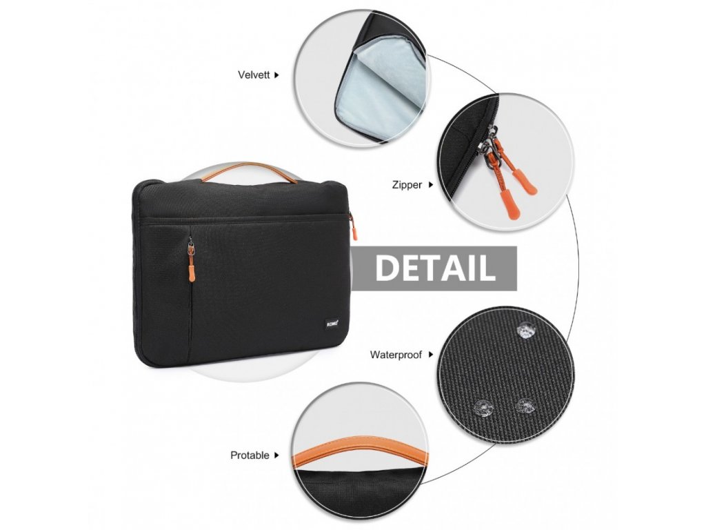 Kono aerodynamické vodeodolné púzdro na notebook 14" je vyrobené z odolnej polyesterovej tkaniny s vodeodolnou úpravou a mäkkým zamatom, poskytujúcim ochranu proti poškriabaniu a nárazom. V čiernom prevedení.