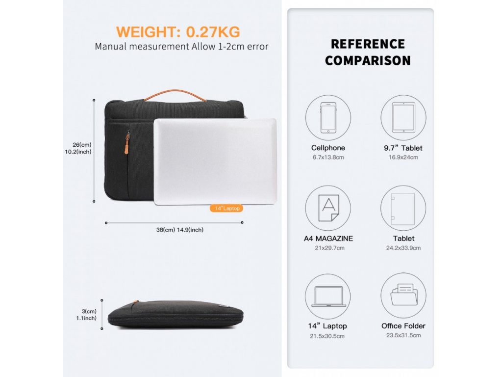 - Predná strana puzdra ponúka horizontálne vrecko na zips, ideálne na uloženie nabíjacích káblov, a vertikálne vrecko na zips, ideálne pre menšie príslušenstvo, ako je myš alebo slúchadlá.