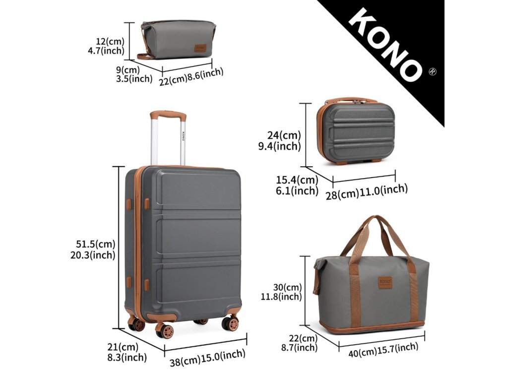 KONO štvordielna sada obsahuje veľký 49L kufor s pevnou škrupinou, kompaktnú príručnú batožinu 8L, všestrannú tašku a kozmetickú tašku. Zvýšte svoj zážitok z cestovania s touto vynikajúcou sadou batožiny, ktorá hladko spája štýl a funkčnosť pre moderného cestovateľa. V sivo hnedom prevedení.