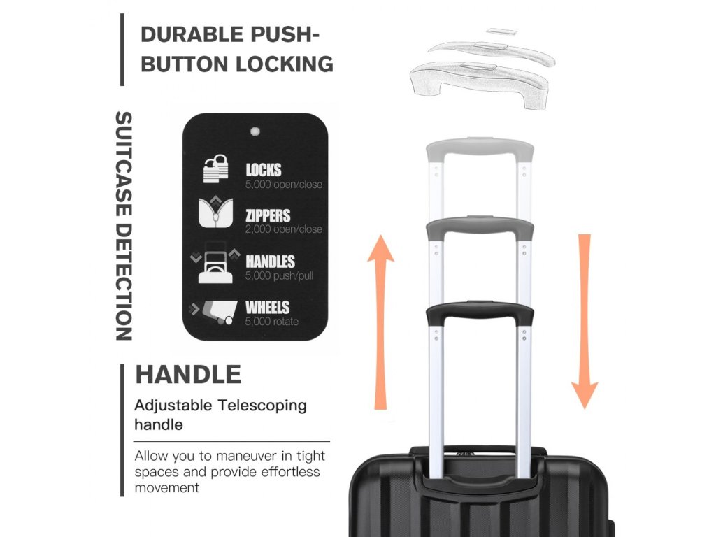 - Zabudovaná robustná horná rukoväť. (19-palcový kufor má iba horné rukoväte, bez bočných rukovätí.)