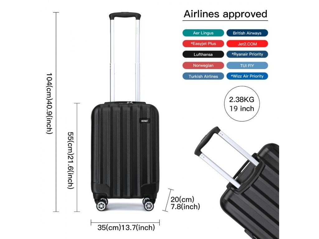19-palcový kufor sa hodí pre väčšinu hlavných leteckých spoločností vrátane BA, EasyJet a Jet2.com. Vždy sa informujte u svojej leteckej spoločnosti, pretože rozmery kabínovej batožiny sa môžu líšiť od povolenej veľkosti.