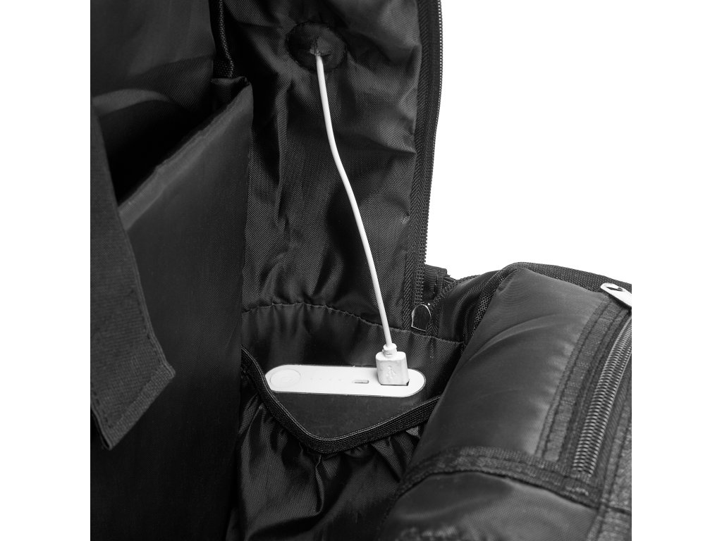 - Vnútorné vrecko na powerbanku s pripojením k vonkajšiemu USB portu.