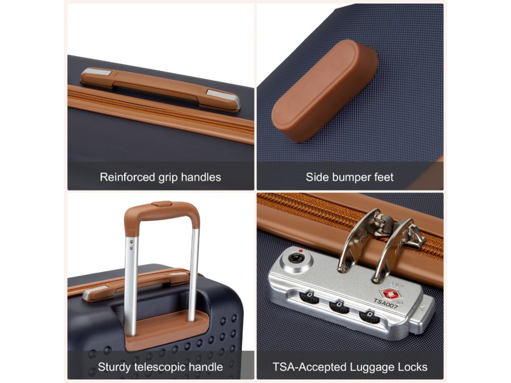- Stabilita: Bočné nožičky pre bezpečné postavenie kufra.