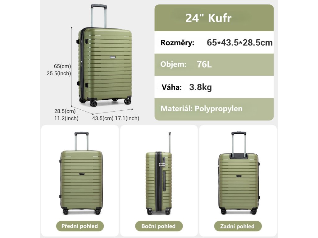 - 24" model: 65 cm (V) x 43,5 cm (Š) x 28,5 cm (H), hmotnosť 3,8 kg, objem približne 76 l